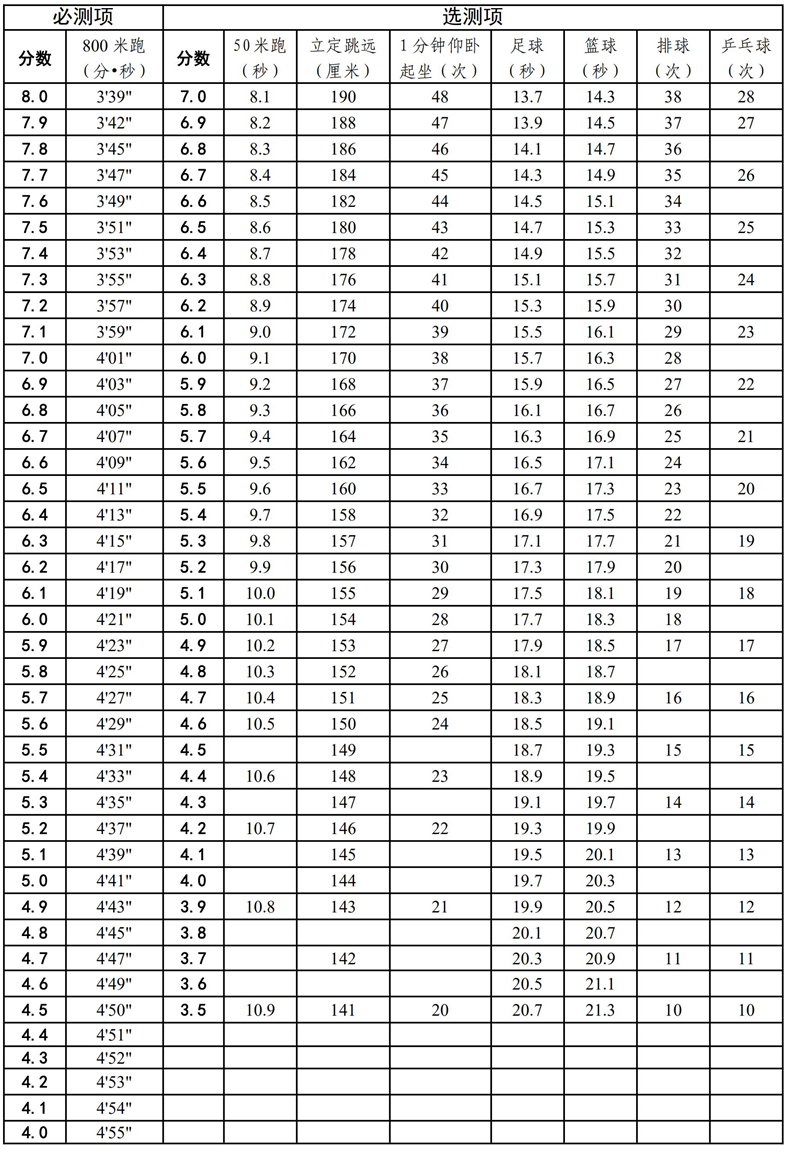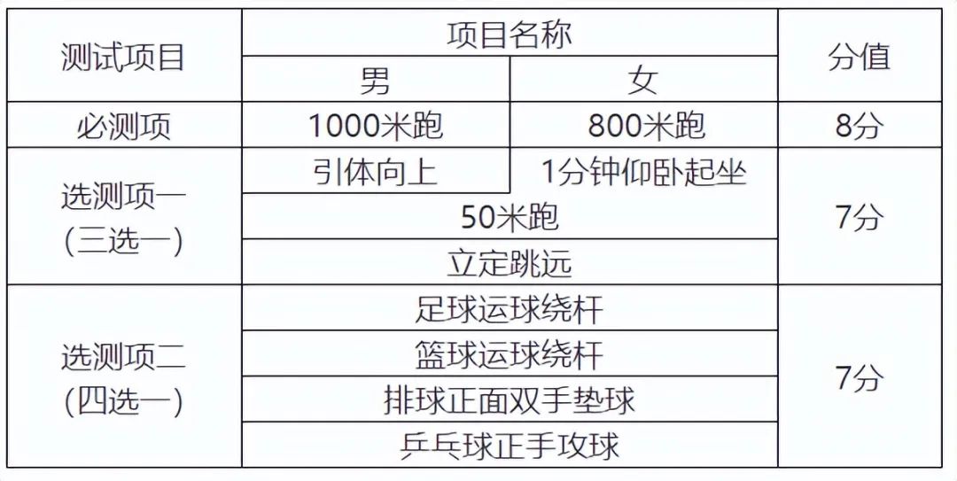 (四)体育统一测试成绩的量化办法。统一测试成绩满分22分,分为必测一项和选测二项,共计三项,内容和分值如下: